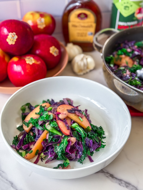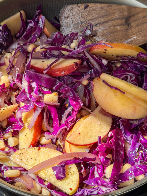 2. Stir in shredded red cabbage and SugarBee apple slices. Cook for 4–5 minutes, stirring
