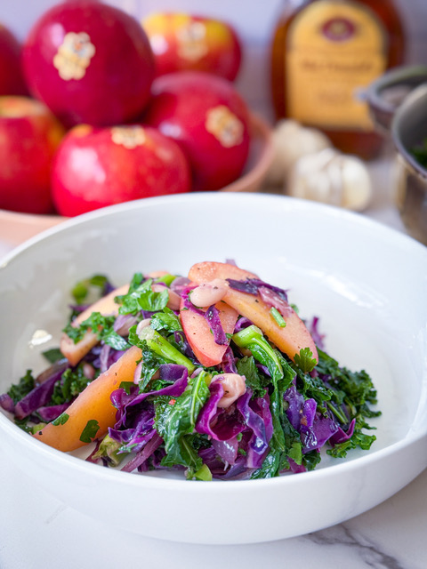 2. Stir in shredded red cabbage and SugarBee apple slices. Cook for 4–5 minutes, stirring