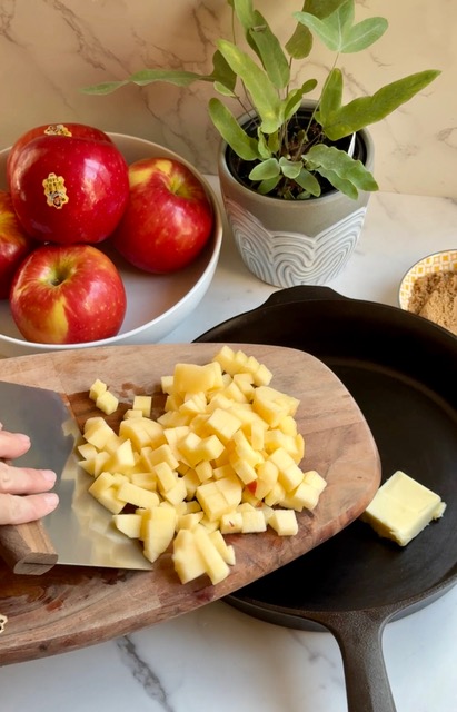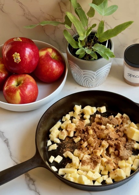 3. In a cast iron skillet, melt butter, then add apples, brown sugar, and Speculaas spice mix.