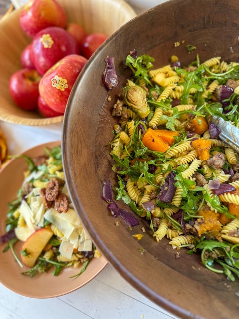 This warm harvest bowl, featuring SugarBee apples captures everything we love about cozy fall flavors, the sweetness of roasted vegetables, the savory comfort of sausage, and the crisp, juicy bite of fresh apples. Each SugarBee slice adds a natural honeyed flavor and satisfying crunch that perfectly balances the hearty roasted squash, caramelized onions, and earthy arugula. Tossed together with pasta and a maple-balsamic Dijon dressing, this salad bridges the line between comfort food and farm-fresh goodness. It’s a simple, wholesome recipe that celebrates seasonal produce, local harvests, and the unmatched flavor of SugarBee apples, ideal for weeknight dinners, autumn gatherings, or holiday table inspiration.