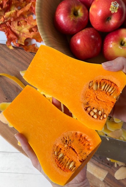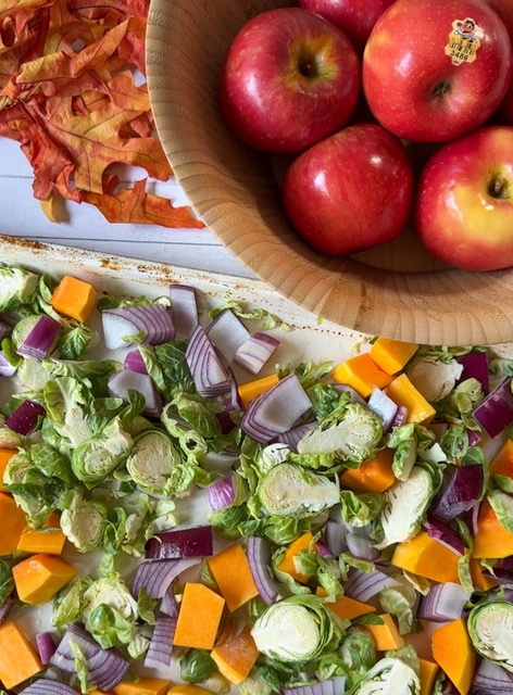 - Prep & roast veggies: Toss cubed squash, Brussels sprouts, onion, and garlic with