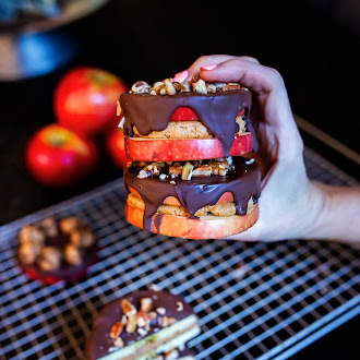 - Roll into little cookie dough balls about 2 tablespoons each. Place a cookie dough ball onto one of the apple slices, then press down another apple slice to make a sandwich. Top with a thin layer of melted dark chocolate, letting it drip down the side. Immediately sprinkle some chopped pecans on top. Enjoy!!!!