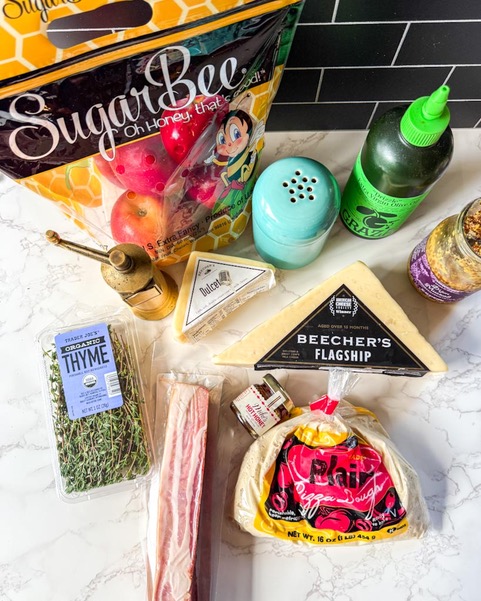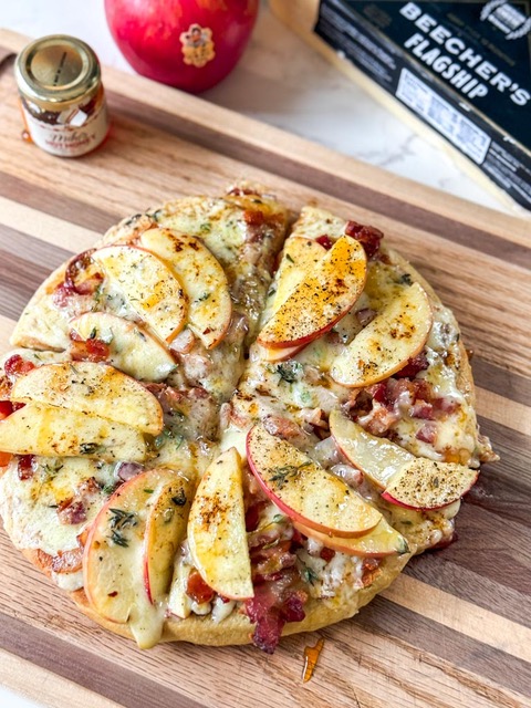 Sweet, crisp SugarBee® apples bring a naturally honeyed balance to this cast-iron deep-dish pizza, pairing beautifully with Beecher’s Flagship Cheese, known for its bold, sharp complexity, and Beecher’s Dulcet Cheese, a creamy, gently sweet cheese that softens and rounds every bite. The combination of savory bacon, fresh thyme, a touch of heat from red pepper flakes, and a finishing drizzle of Mike’s Hot Honey creates a layered sweet-savory contrast that feels indulgent yet familiar. Baked entirely in the oven until bubbling and caramelized, this pizza is cozy, rich, and perfect for sharing.